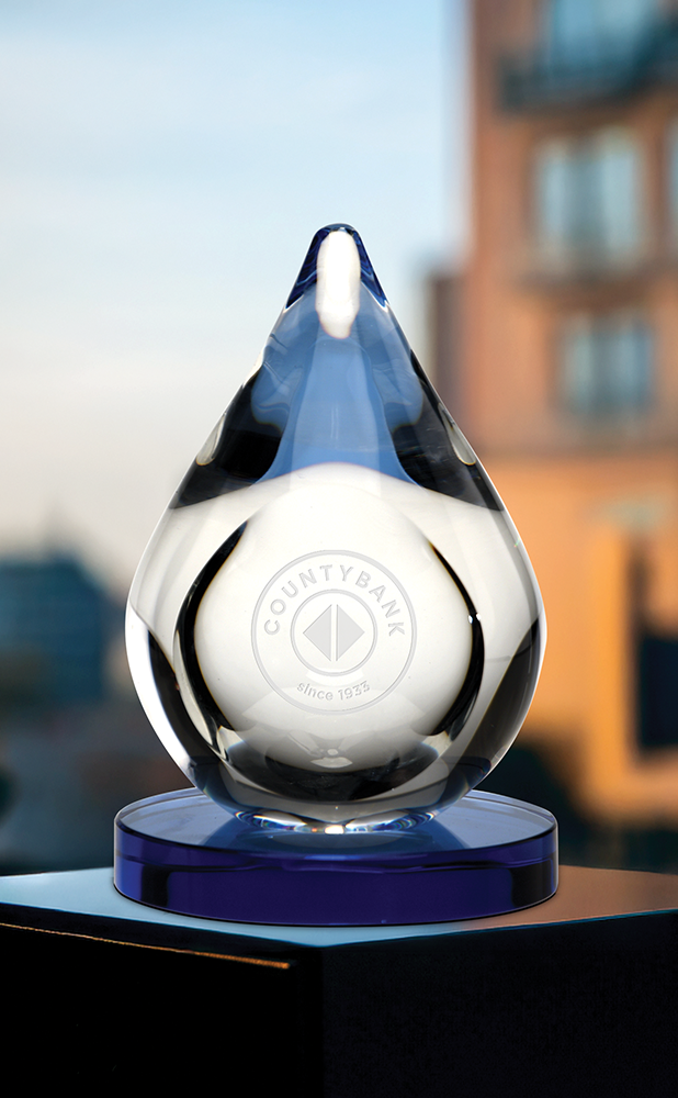 - - This elegant award features a blue base that beautifully enhances its teardrop design.